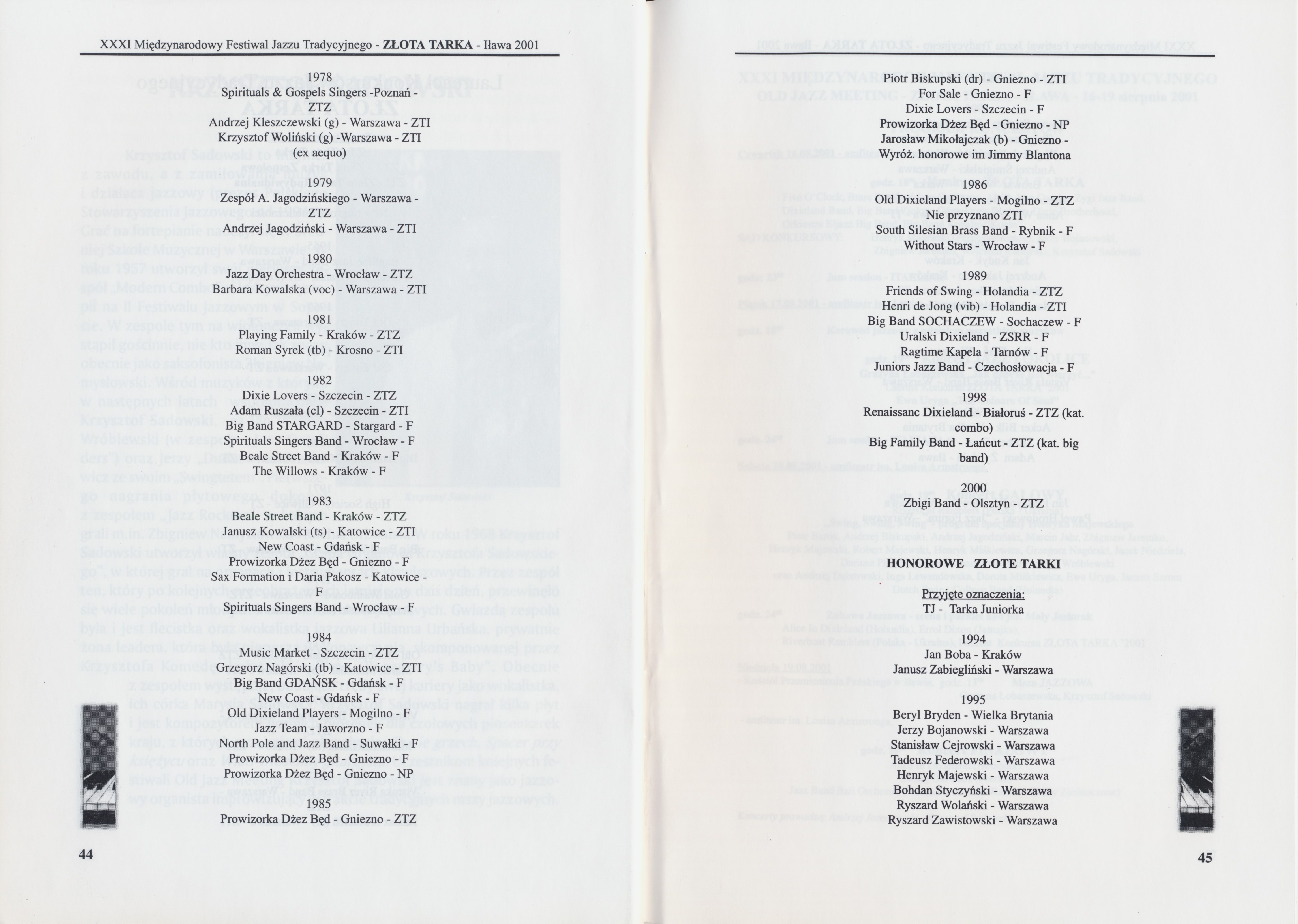 Program Międzynarodowego Festiwalu Jazzu Tradycyjnego "Złota Tarka", 16-19 sierpnia 2001 r.