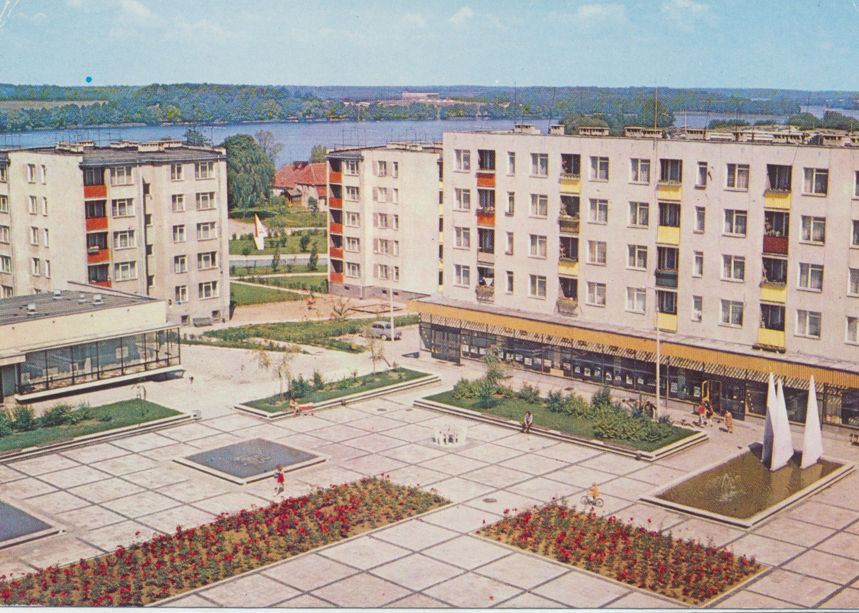 Stare Miasto w Iławie - lata 70-te, w tle widoczna ulica Konstytucji 3 Maja oraz zabudowania na cyplu (ul. Duboisa) oraz jezioro Jeziorak. W centrum zdjęcia widoczny zegar słoneczny, który funkcjonuje w tym miejscu do dziś.