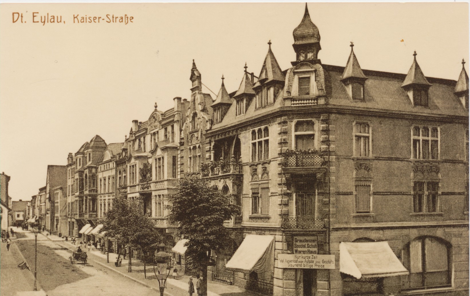 Iława - ulica Cesarska (Kaiserstrasse) lata 1933/34. Na pierwszym planie widoczny dom handlowy, w którym w tym czasie była duża wyprzedaż z powodu likwidacji sklepu. " Produkowało się tam specjalistyczne obuwie i mieli zaskakująco niskie wtedy ceny - żyd, który był właścicielem uciekał przed faszystami" - w 1933 roku Hitler został kanclerzem Niemiec). Opis z opowieści Pani Moniki Krajnik.