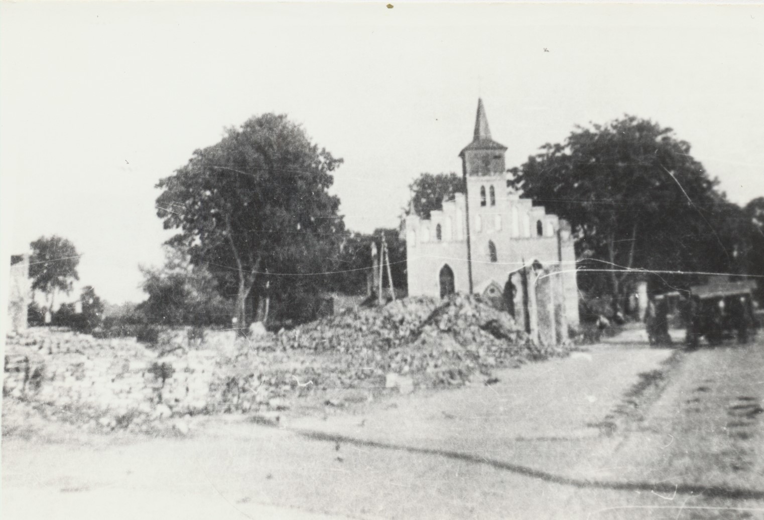 Iława lata 50-te - ulica Cesarska (Kaiserstrasse) - za czasów polskich - już pod nazwą Niepodległości. Plac przed ratuszem. W centrum zdjęcia kościół polski, po wojnie krótko funkcjonował jako ewangelicki. Przed nim widoczne ruiny domu handlowego, które znajdował się vis a vis ratusza.