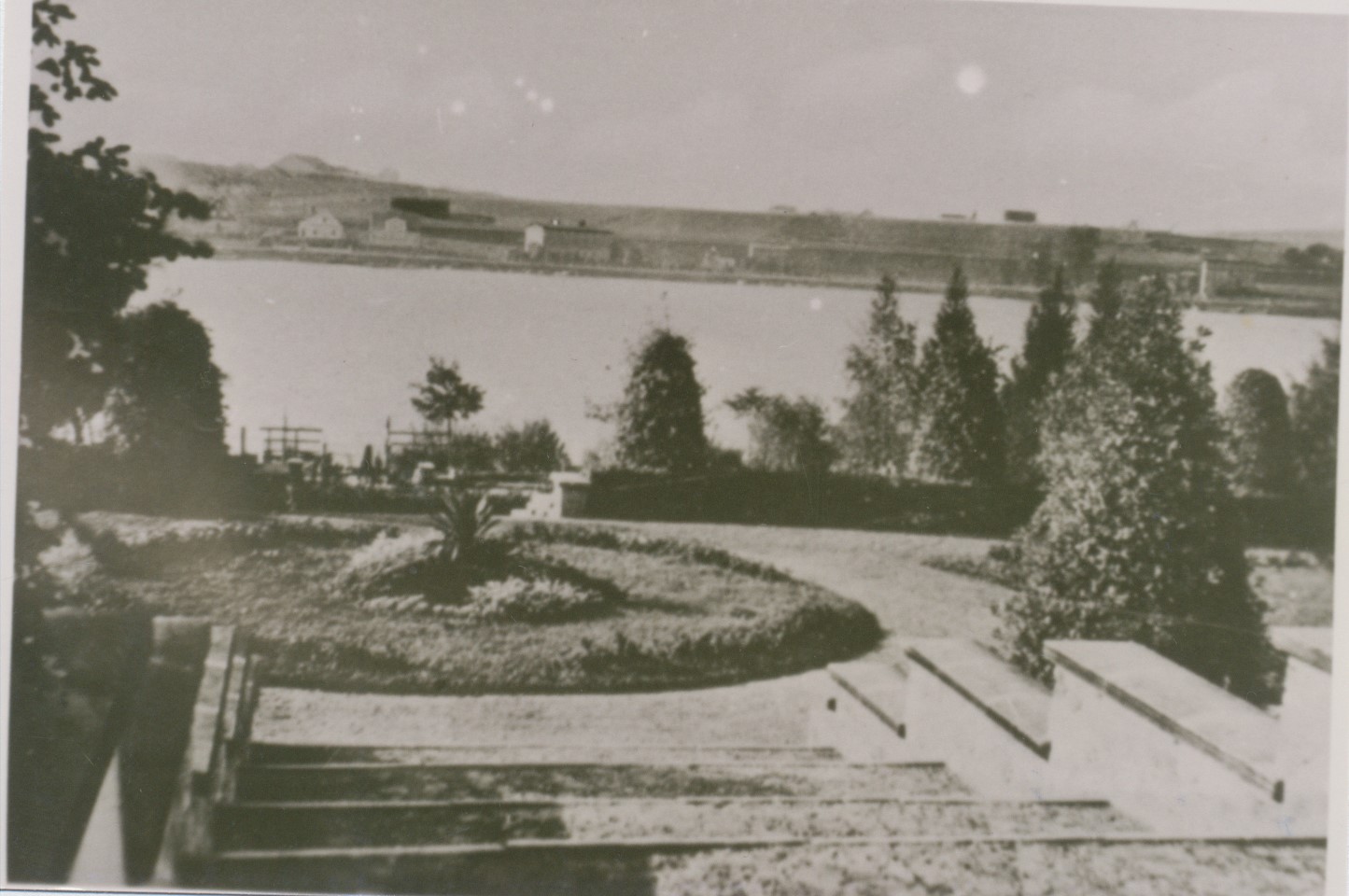 W centrum zdjęcia jezioro Jeziorak. Za nim widoczna obecna ul. Mickiewicza z nielicznymi jeszcze wówczas zabudowaniami. Powyżej osiedle Gajerek - niemal puste. Na pierwszym planie park i schody prowadzące do Hali Miejskiej.