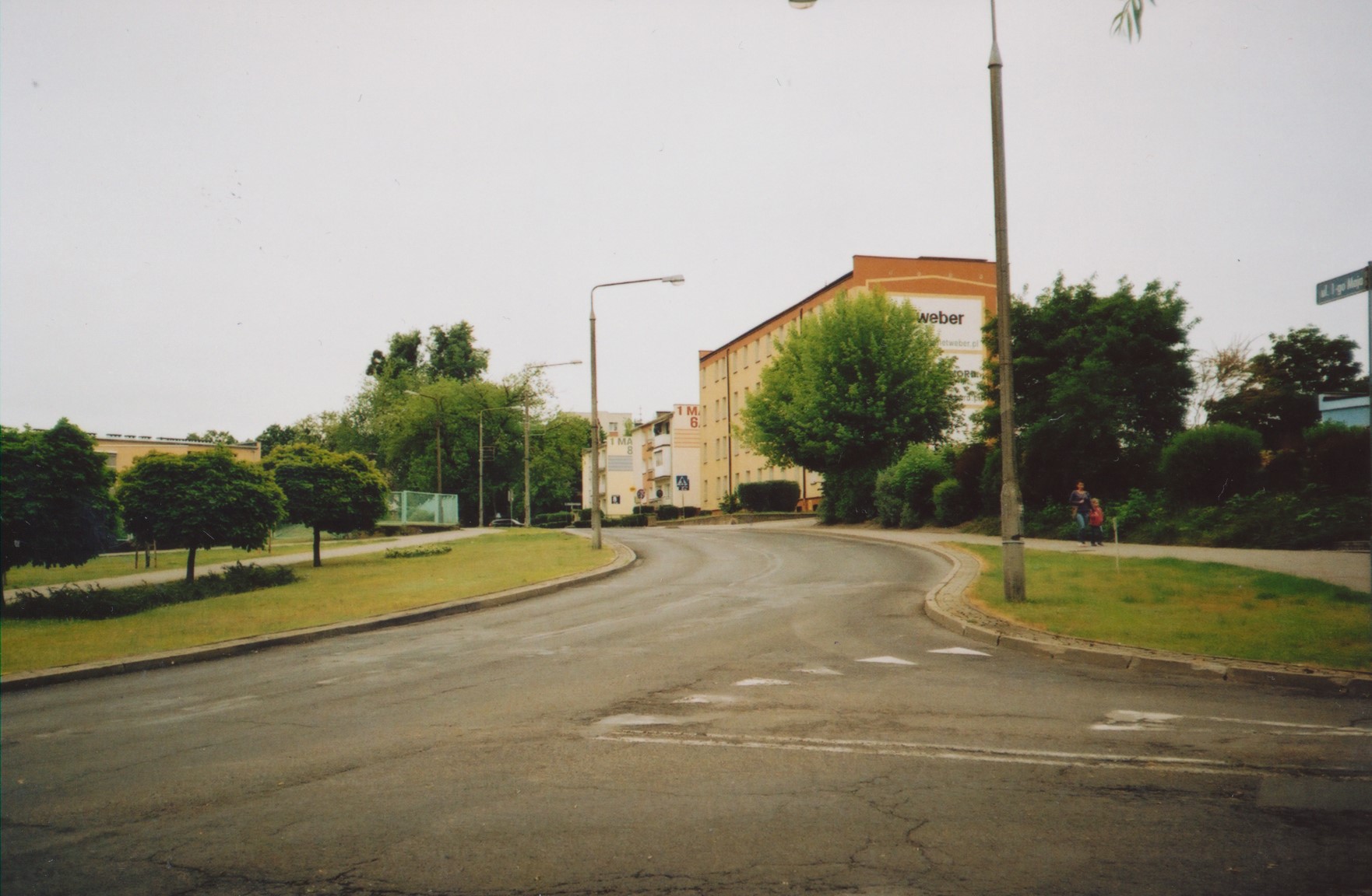 Rok ok. 2010. Widok na początek ul. 1 Maja (w prawo wjazd na ul. Nowomiejską). Po lewej za drzewami widoczne zabudowania Zespołu Szkół um. Botehaterów Września 1939 roku, popularnie zwanego "budowlanką".