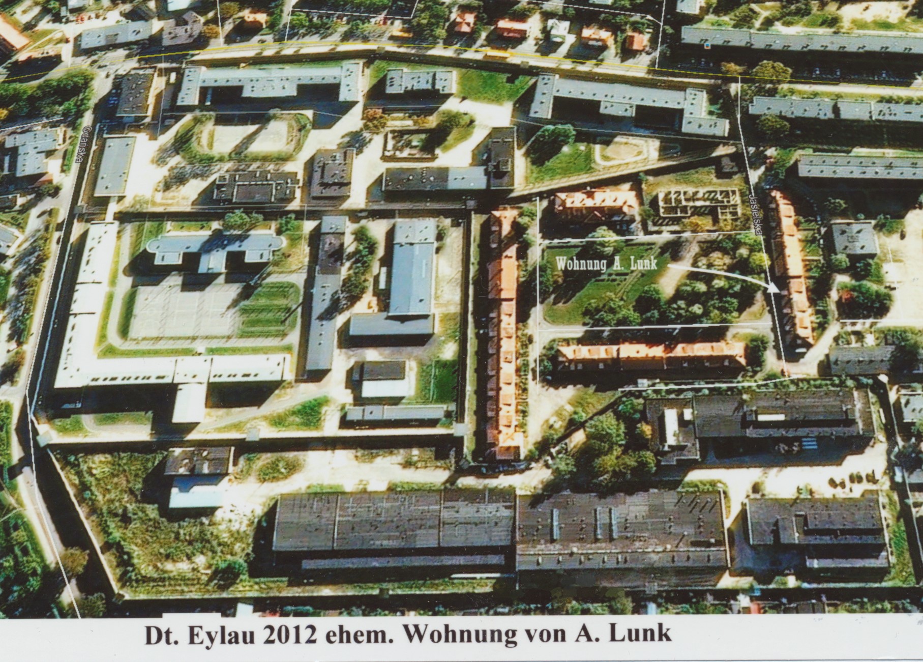 Widok na Zakład Karny w Iławie. Białą linią zaznaczony wjazd na ul. Jasielską (dawniej Hibnera). Czerwone dachy to domy mieszkalne na placu przy ul. Jasielskiej, a po lewej zabudowania Zakładu Karnego w Iławie. Potomek Pana Lunk zaznaczył mieszkanie swojego przodka Adolfa.