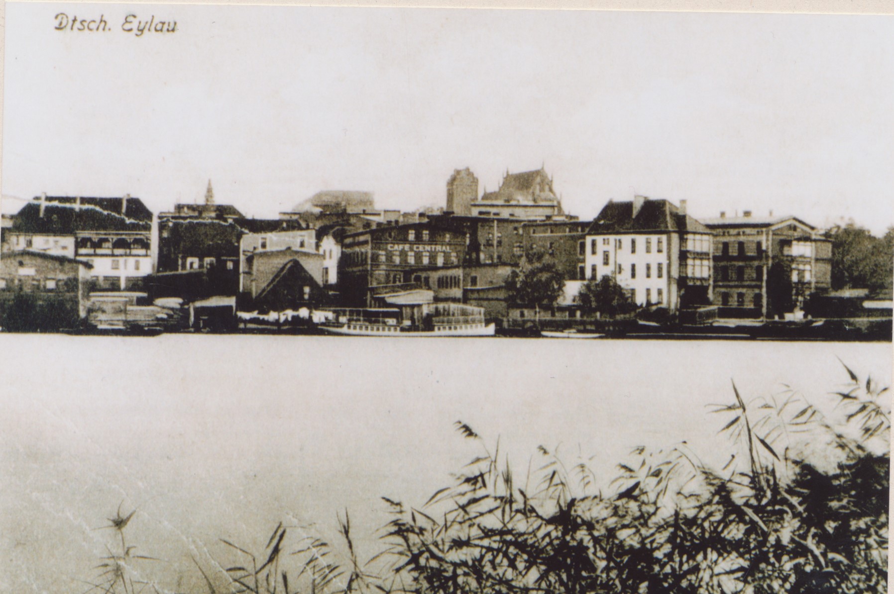 Gęsto zabudowane nabrzeże wschodnio-południowej części Jezioraka w Iławie (ul. Lipowa). Po prawej widoczne miejsce, gdzie wówczas i dziś znajduje się most dzielący Mały i Duży Jeziorak (obecnie ul. Konstytucji 3 Maja). Nad miastem wyraźnie góruje "czerwony" kościół - wówczas protestancki. Po lewej prawdopodobnie widać wieżę kościółka polskiego (wtedy ul. Zalewska, obecnie ul. Dąbrowskiego).