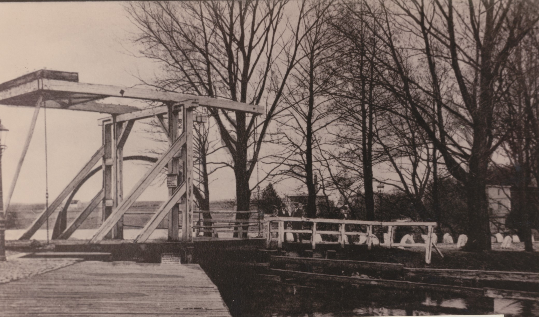 Most zwodzony (zdjecie z początku XX w.). Prawdopodobnie na zdjęciu widoczna jest drewniana konstrukcja mostu zwodzonego zbudowana w 1850 r., która w 1905 roku została zastąpiona przez stały most, co wymagało wzmocnienia brzegów jeziora, a tym samym zawężenia przepływu, co praktycznie uniemożliwiło już większym jednostkom wpływanie w granice dzisiejszego Małego Jezioraka.