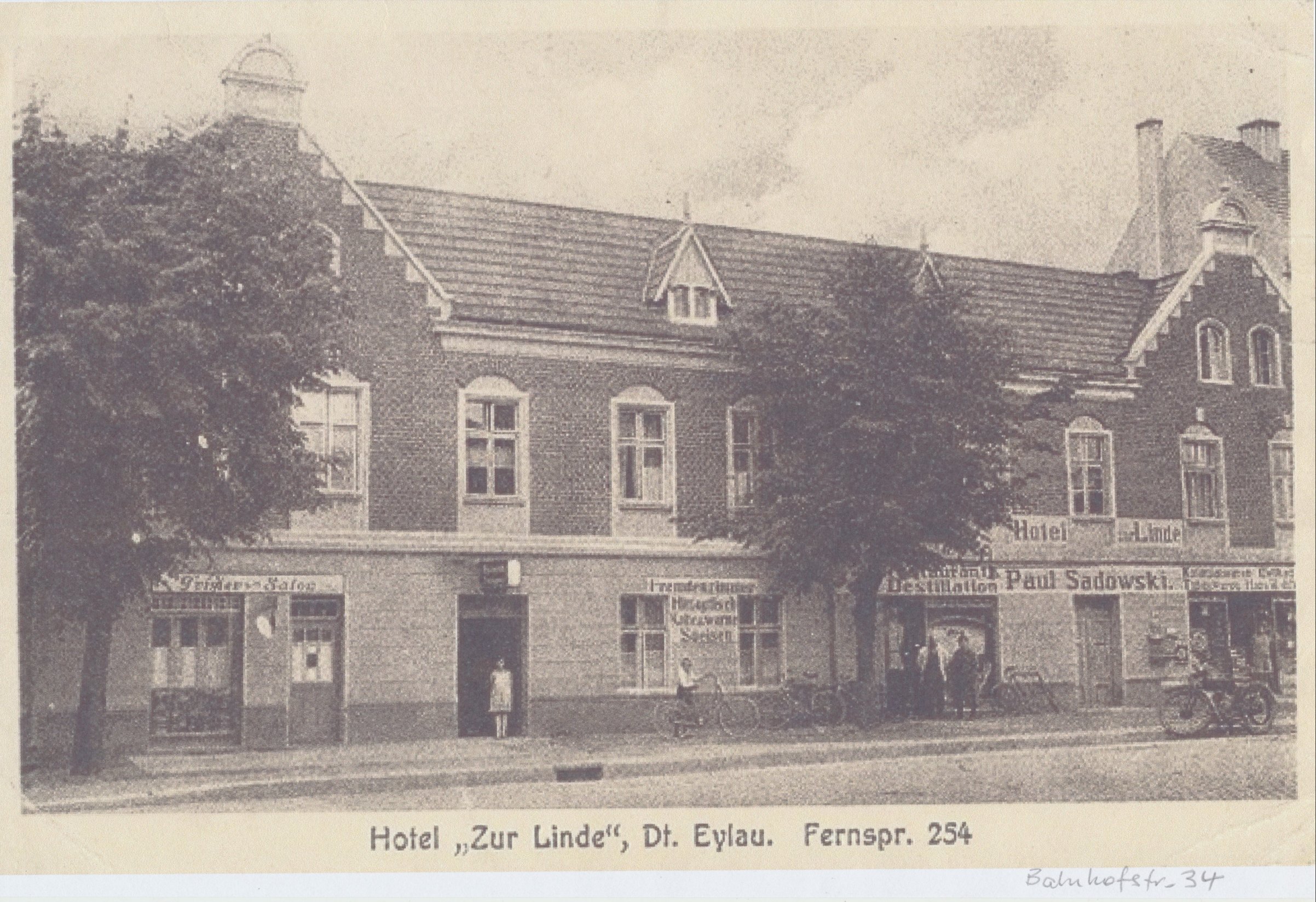 Hotel "Pod Lipą", Niemiecka Iława - numer telefonu 254 (taki napis widnieje pod zdjeciem) z dopiskiem poniżej - Bhnhofstrasse 34 (ul. Dworcowa 34). "Hotel prowadził Paul Sadowski. Zdjęcie z lat 20-tych XX w. Były tam pokoje gościnne i restauracja, a po lewej fryzjer" - wspomina Pani Monika Krajnik. Obecnie ul. Wyszyńskiego/Wojska Polskiego (vis a vis Kauflandu)