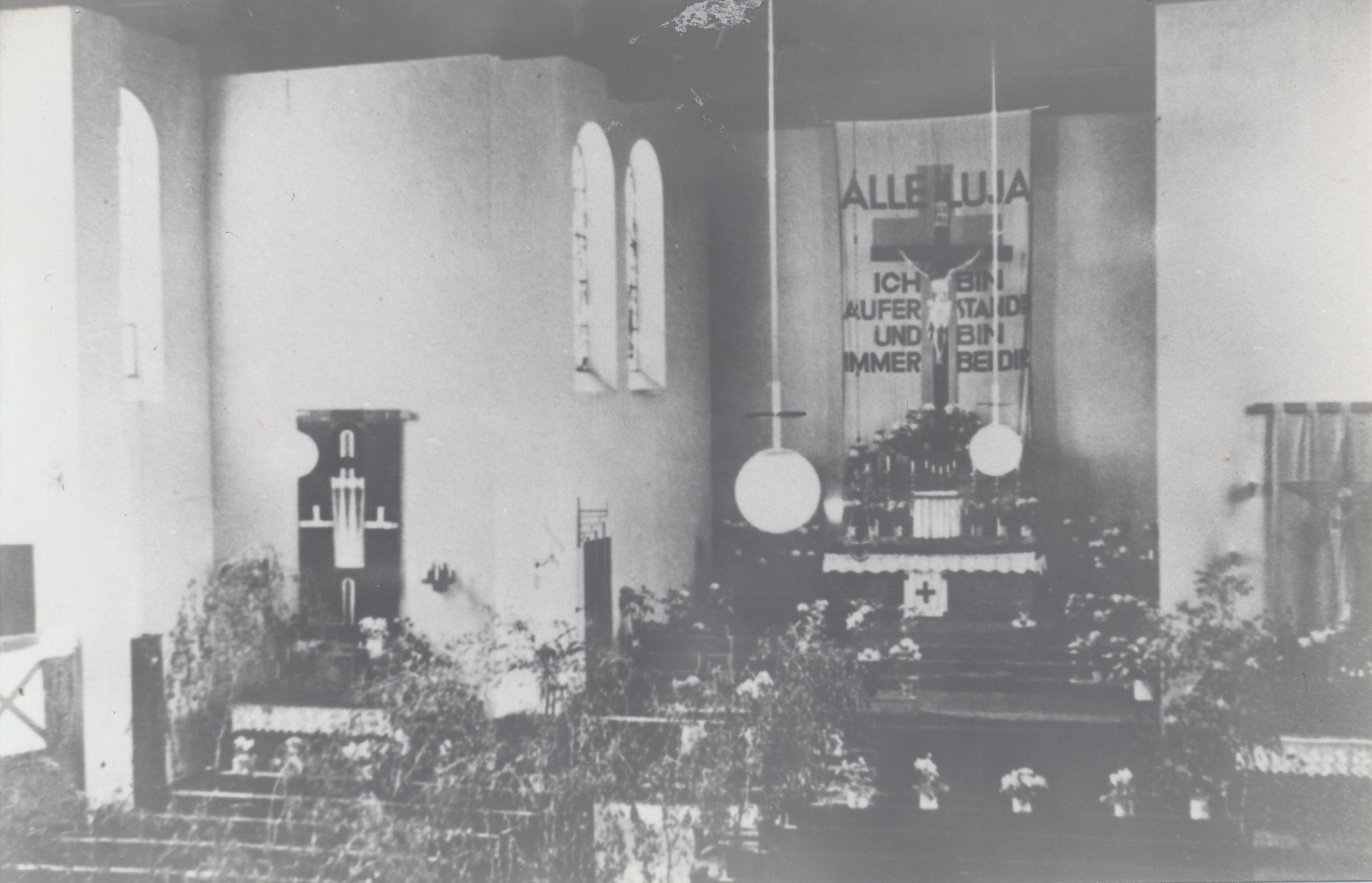 Zdjęcie prawdopodobnie z okresu "Zielonych Świątek". Napis na ołtarzu: "Zmartwychwstałem i jestem na zawsze z Wami". "Po wojnie nie było ławek, została tylko drewniana podłoga" - wspomina Pani Monika Krajnik. - "Organy były zepsute, a figura Matki Bożej w bocznym ołtarzu została spalona, tylko krzyż ocalał." Według wspomnień Pani Moniki styl tego kościoła był wzorowany na kościele niemieckim w Saarbrucken (miasto na granicy z Francją).