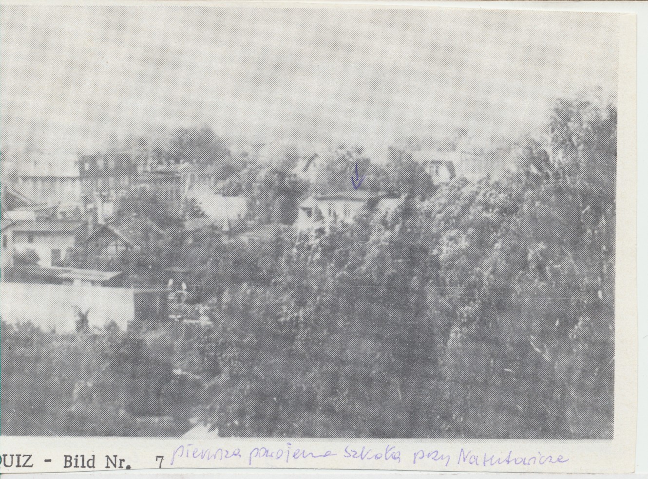 Na zdjęciu zaznaczona niebieską strzałką pierwsza w Iławie szkoła, otwarta po wojnie, która mieściła się przy ul. Narutowicza. Zdjęcie zrobione z perspektywy dzisiejszej ul. Barlickiego (?)