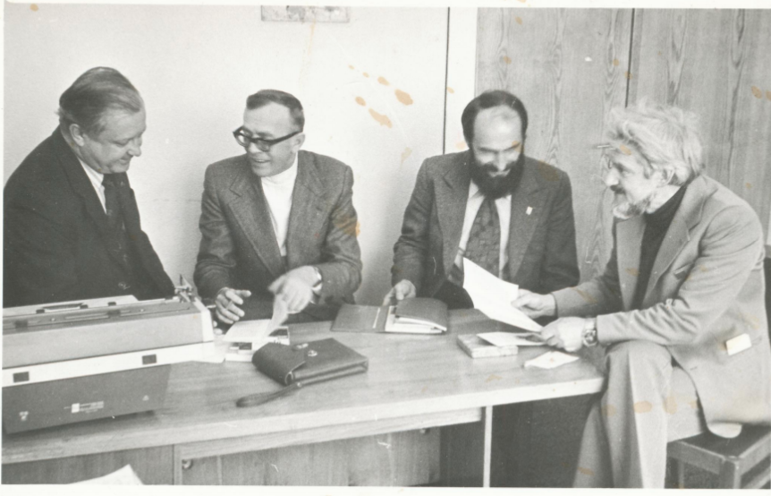 Zbigniew Nienacki (drugi z lewej) w Kaliningradzie (1978 r.). Na odwrocie zdjęcia informacja: Kaliningrad 1978 Redakcja "Prawdy" Iwanow, Ja, Kruk i redaktor"