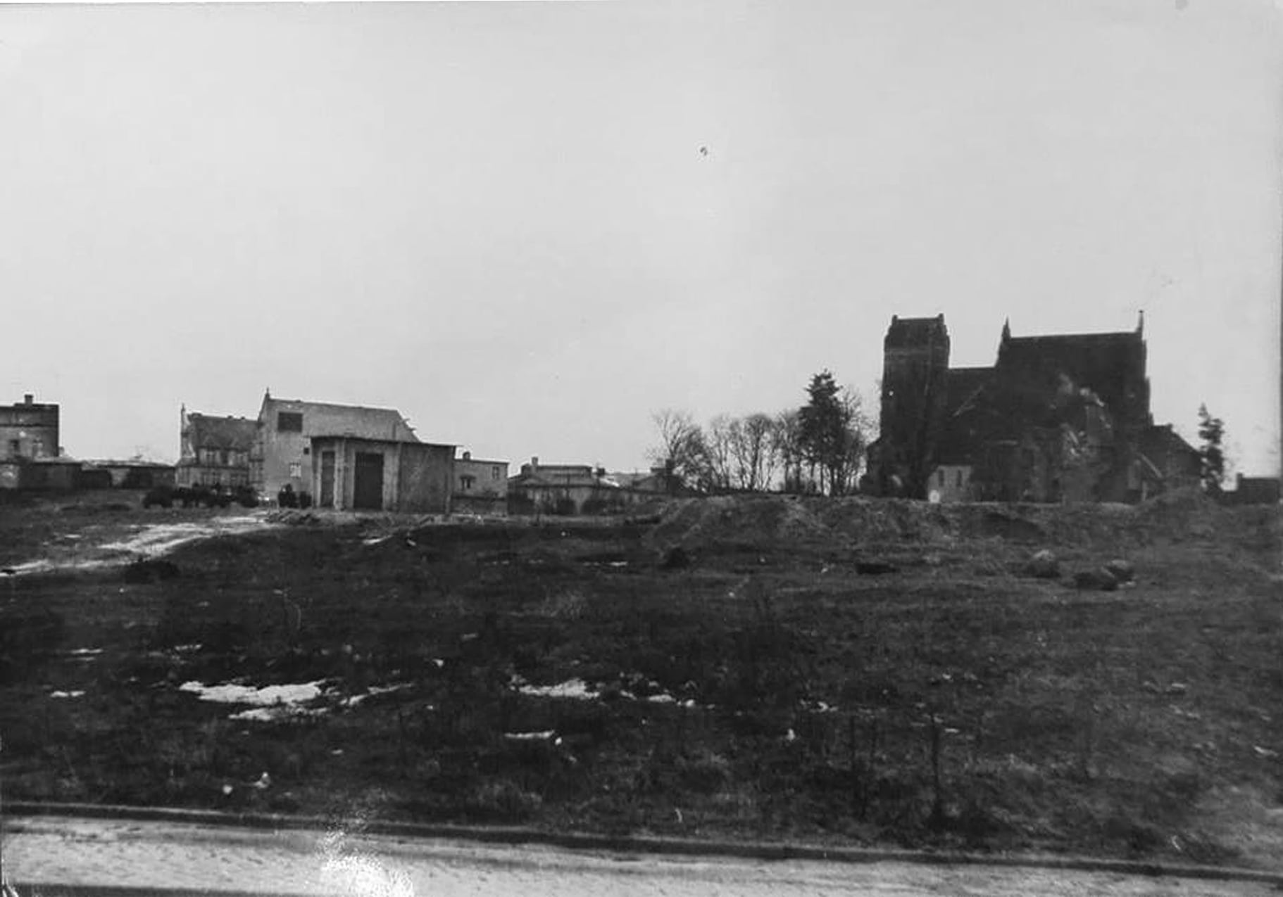 Unikatowe ujęcie zrujnowanego iławskiego Starego Miasta od strony cypla i ul. Konstytucji 3 Maja. Doskonale widoczny "czerwony" kościół i zachowana plebania, a po lewej zniszczony ratusz. W centrum zdjęcia widoczna Hala Miejska.