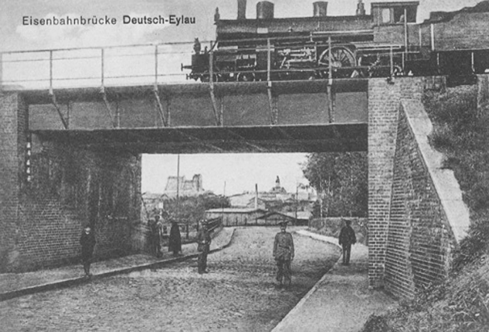 Most Kolejowy w niemieckiej Iławie na obecnej ul. Sobieskiego - istniejący do dziś. W tle po lewej widoczny kościół "czerwony" oraz Ratusz Miejski.