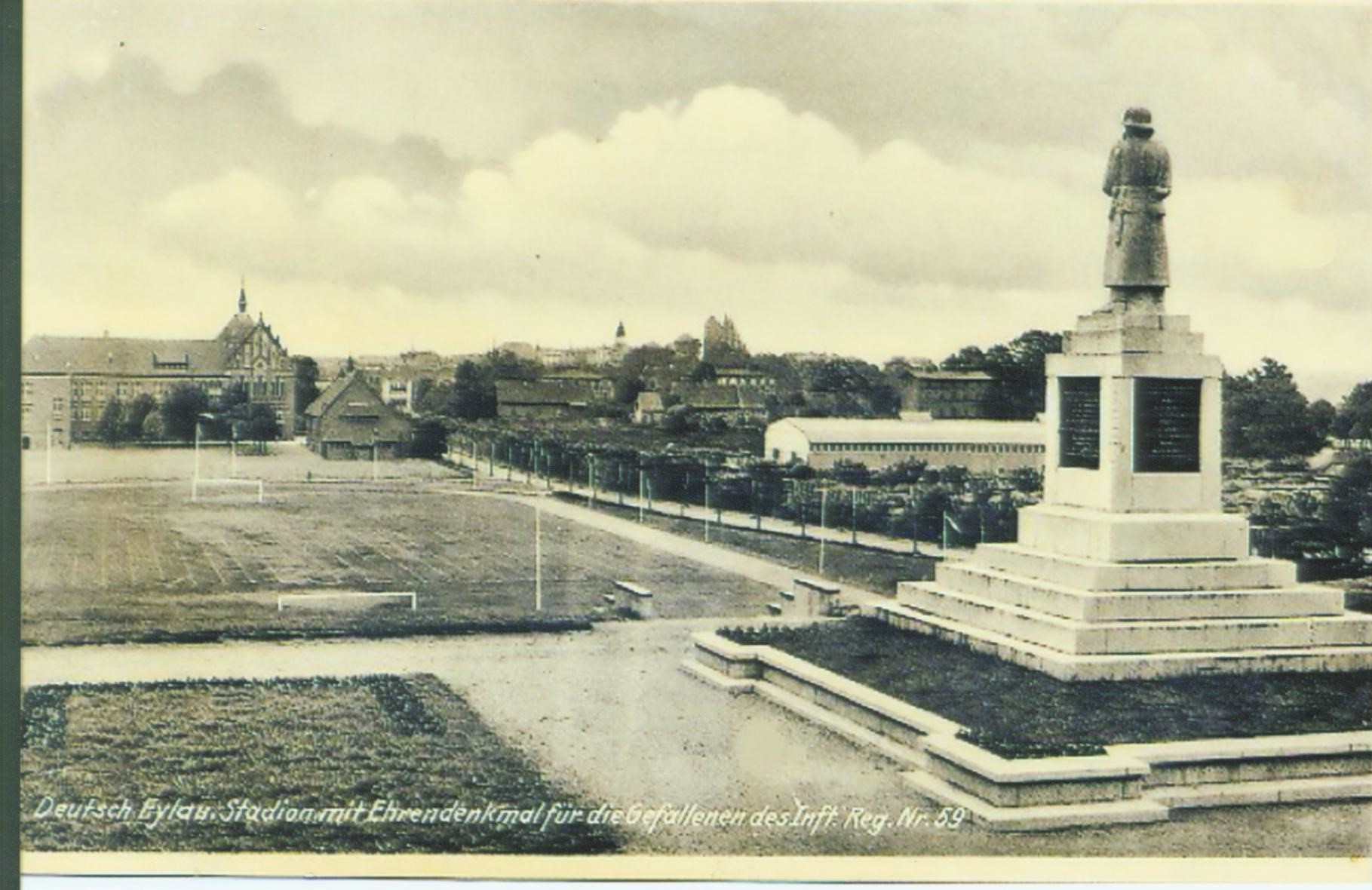 Deutsch Eylau. Stadion z pomnikiem poświęconym poległym z regimentu nr 59 Po lewej widoczny budynek męskiego gimnazjum (dziś Lo im. S. Żeromskiego) Daleko na horyzoncie widoczna wieża iławskiego ratusza oraz zarys wieży i dachu "czerwonego" kościoła